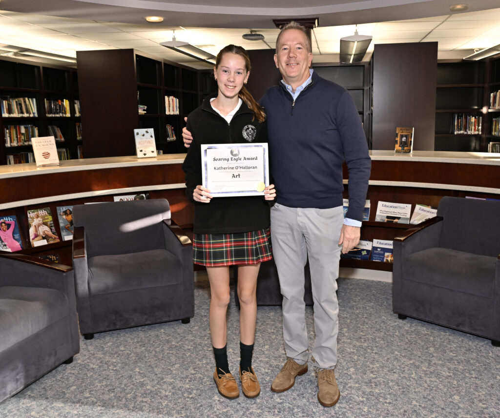 They are enthusiastic, compassionate, creative, and intelligent young women dedicated to personal and academic growth. Quarter one recipients celebrated with their families, nominating teachers, and IHA staff at a special reception held on November 11, 2025. Miss Kerry Carroll ’04, principal of Immaculate Heart Academy, presented the Soaring Eagle Awards to the following teacher-nominated students standing left to right in group photo: