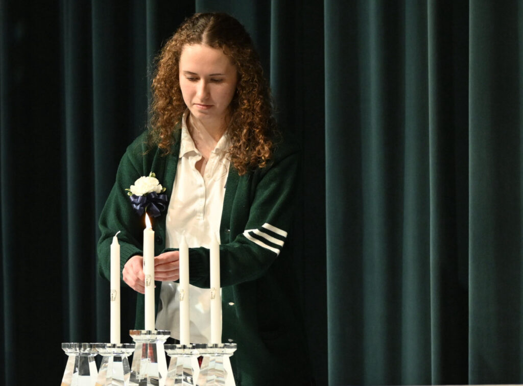 The NHS induction ceremony opened with an invocation led by Anne Moore ’26, NHS executive board member; a welcome message from Miss Kerry Carroll ’04, IHA principal; and congratulatory remarks from Olivia Valente ’26, NHS president. NHS executive board members then led a candle-lighting ceremony, followed by the induction of new members by Cavan Clancy ’26, NHS vice president. Alana Flores ‘26, NHS executive board member, led the newly inducted members in the Honor Society pledge. Inductees then listened to a keynote address by Mr. Jason Schlereth P’27, ’28, IHA president. The ceremony concluded with Tara McCarthy ’26, NHS secretary, singing the IHA Alma Mater, accompanied by Danica Libanan ’26.