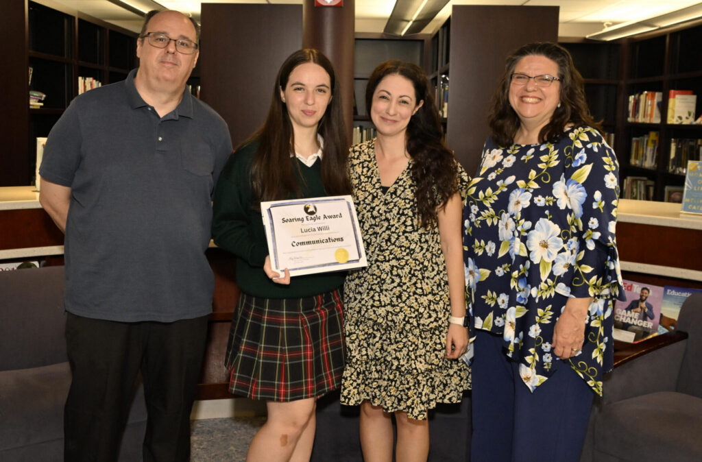 They are enthusiastic, compassionate, creative, and intelligent young women dedicated to personal and academic growth. Quarter three recipients celebrated their achievement with their families, nominating teachers, and IHA staff at a special reception held on April 16, 2026. Miss Kerry Carroll ’04, principal of Immaculate Heart Academy, presented the Soaring Eagle Awards to the following teacher-nominated students, standing left to right in group photo: