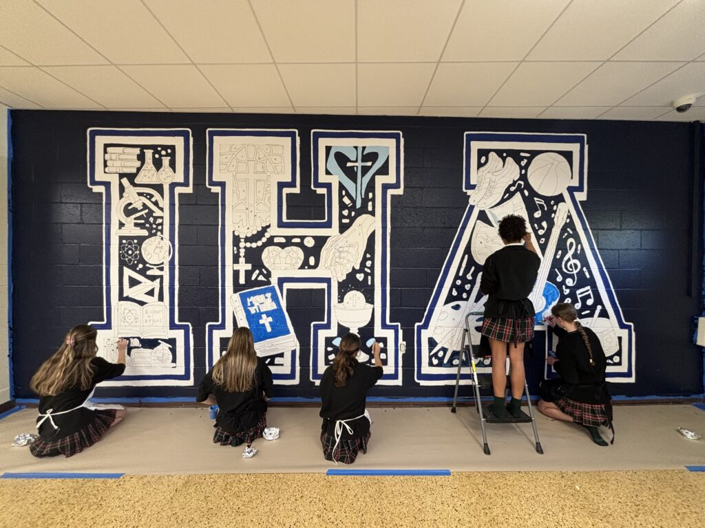 The mural features large IHA letters in a bold Varsity-Style font, representing the spirit and identity of the school. Each letter contains imagery that represents a different aspect of student life at IHA. The “I” represents academics, and within this letter are images symbolizing learning and scholarship. The “H” represents Faith and service, symbolizing IHA’s strong Catholic identity and commitment to service. Finally, the “A” represents activities and student life, which includes various images of athletics, the arts, and extracurricular activities.