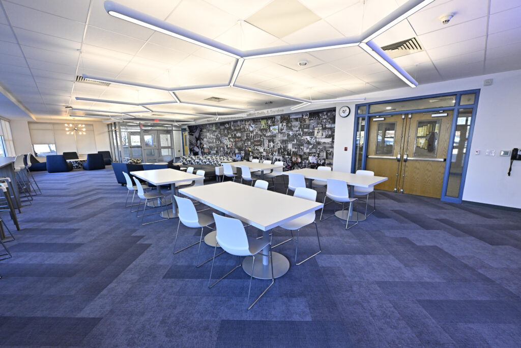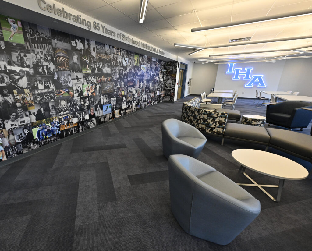 In 2024, IHA students were thrilled to begin the school year and see their newly renovated multi-purpose room. The new design includes comfortable couches and chairs; a picture wall celebrating our 65 years as a school; new lighting including a sparkling chandelier; and a beautiful lighted IHA logo that is visible from the parking lot. The renovated room is a relaxing new space for students to study and unwind with their fellow sisters.